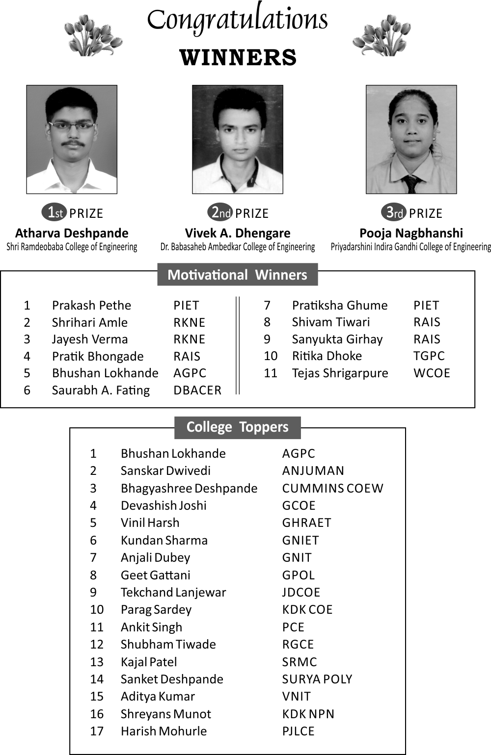 The list of first three rankers, college toppers and motivational prize winners is given below. The quiz winners are given prizes at the hands of Padmvibhushan Hon.Er. V.K. Aatrey, Chief Guest for Engineer's day celebrations.