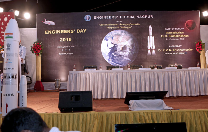 Engineers' Day 201617th Sept. 2016 at Rani Kothi, NagpurTheme : "Space Exploration-Emergining Scenario, Prospects & Challenges"Guest of Honour : Padma Bhushan Er. K. Radhakrishnan President of Function : Dr. Y. V. N. Krishnamurthy Report of Engineers’ Day 2016 Celebration Engineers' Day 2016 was celebrated on a very grand scale at Ranikothi, Nagpur on 17.9.2016.